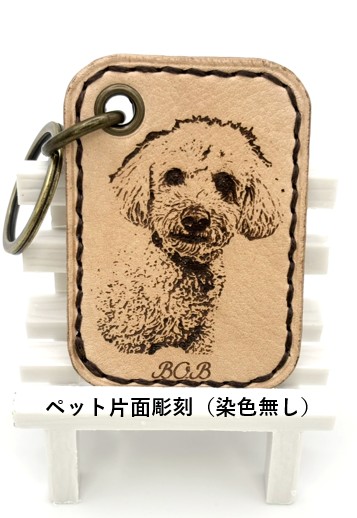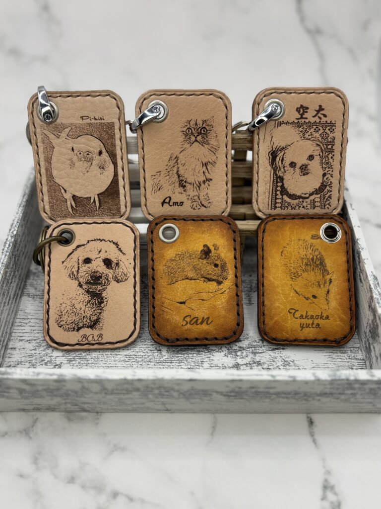 ペットの写真を加工して革にレーザー彫刻で描きキーホルダーに仕上げています。